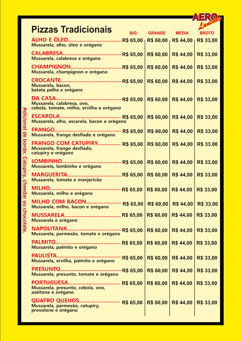 Welcome to Aero Lanches, a hidden gem located in Abranches, Curitiba! This delightful eatery specializes in savory and sweet pizzas, ensuring there’s something for every palate. The menu offers a range of options, from a Broto Pizza with two flavors for R$33 to a generous Big Pizza with three flavors for R$64, perfect for sharing or indulging alone. If you’re feeling adventurous, don’t miss their delicious calzones, crafted with the same love and attention as their pizzas, priced at R$73.